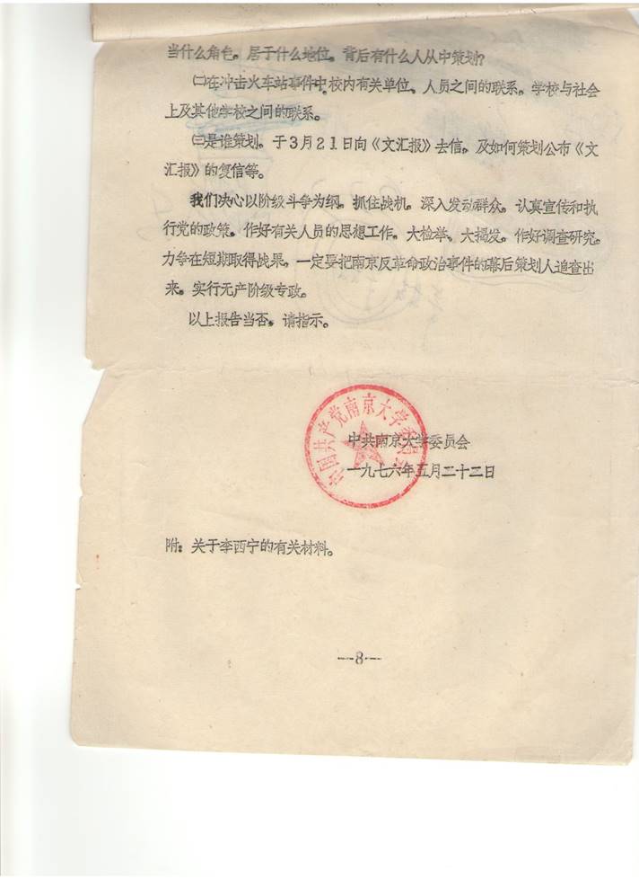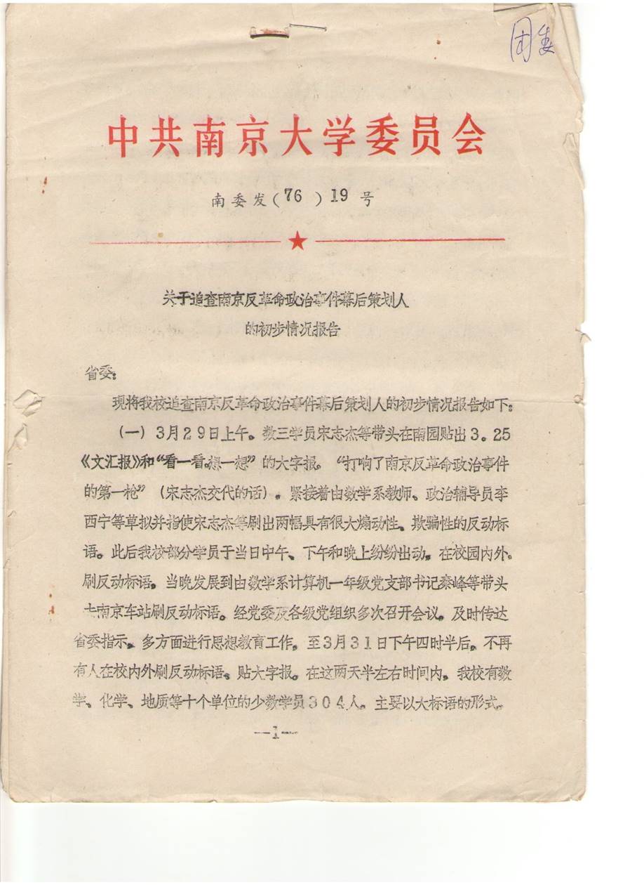 现将我校追查南京反革命政治事件幕后策划人的初步情况报告如下: