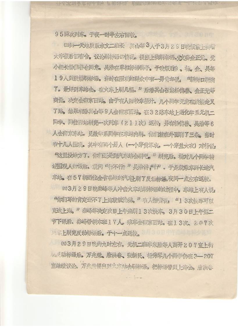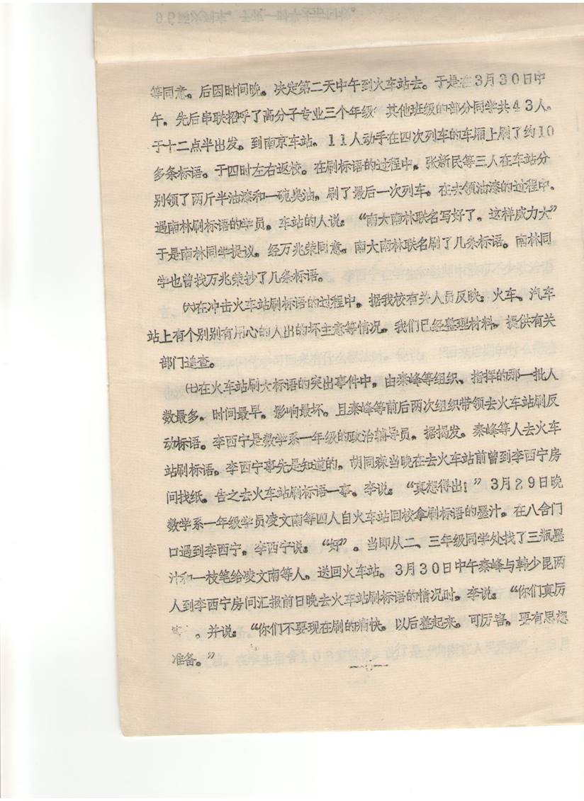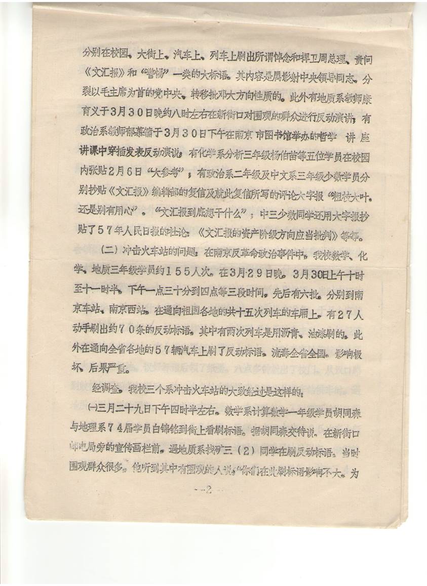 (二)冲击火车站的问题:在南京反革命政治事件中,我校数学、化学、地质三年级约155人次,在3月29日晚,3月30日上午十时至十时半,下午一点三十分到四点等三段时间,先后有六批,分别到南京车站、南京西站,在通往祖国各地的共十五次列车的车厢上,有二十七人动手刷出约七十条的反动标语。其中有两次列车是用沥青,油漆刷的。此外在通向全省各地的57辆汽车上刷了反动标语。流毒全省全国。影响极坏,后果严重。