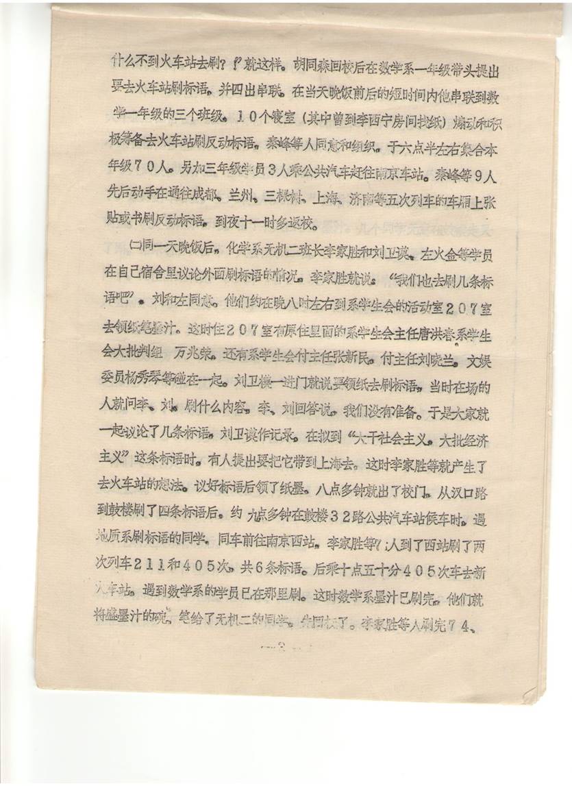 (2)同一天晚饭后,化学系无机二班李家胜和刘卫漠、左火金等学员在自己宿舍里议论外面刷标语的情况。李家胜就说:“我们也去刷几条标语吧”。刘和左同意。他们约在晚八时左右到系学生会的活动室207室去领取纸笔墨汁。这时住207室有原住里面的系学生会主任唐洪春、系学生会大批判组万兆荣、还有系学生会副主任张新民、副主任刘小兰、文娱委员杨秀琴等碰在一起。刘卫漠一进门就说要领纸去刷标语。当时在场的人就问李、刘刷什么内容,李、刘回答说,我们没有准备。于是大家就一起议论了几条标语,刘卫漠作记录。在拟到“大干社会主义,大批经济主义”这条标语时,有人提出要把它带到上海去。这时李家胜等就产生了去火车站的想法。议好标语后领了纸墨,八点多钟就出了校门。从汉口路到鼓楼刷了四条标语后,约九点多钟在鼓楼32路公共汽车站候车时,遇地质系刷标语的同学,同车前往南京西站。李家胜等七人到了西站刷了两次列车211次和405次共六条标语。后乘十点五十分405次车去新火车站,遇数学系的学员已在那里刷。这时数学系的墨汁已刷完,他们就将盛墨汁的碗,笔给了无机二的同学,先返校了。李家胜等人刷完74、95次列车,于夜一时半回校。