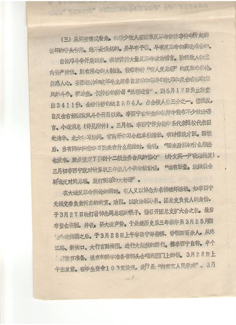 在大造反革命舆论的同时,有人又以悼念为名搞破坏活动。如李西宁无视党委负责同志的教育、劝阻。以政治辅导员,团总支负责人的身份,于3月27日晚打着悼念周总理的幌子,借召开团总支扩大会之机,最后布置去梅园。并说,要大造声势。于是继历史系三年级学员3月25日翻墙头进梅园之后,于3月28日上午李西宁等指挥,带领四百余人,从珠江路、新街口、大行宫到梅园,进行大规模的游行。据李西宁自称,半个月前就有准备,说有的同学准备带榔头去砸梅园门上的锁。3月28日上午出发前,在学生宿舍103室就说,此行是“向南京人民示威”。3月28日下午李西宁有在学生宿舍说:“数学系有革命传统。文化大革命初高水平的大字报就是数学系贴出来的。”3月29日上午在刷大标语时,有的同学下课遇李西宁。李问我们这样干带劲不带劲,还说:“我们就是和他们对着干,和反周总理的逆流对着干”等等(数学系XXX揭发)。因此,数学系少数人于3月29日上午带头张贴3.25文汇报和“看一看,想一想”的大字报,李西宁紧接着又自己带头出来草拟和指使宋志杰等刷大标语,秦峰等带头去火车站刷标语就不是偶然的了。