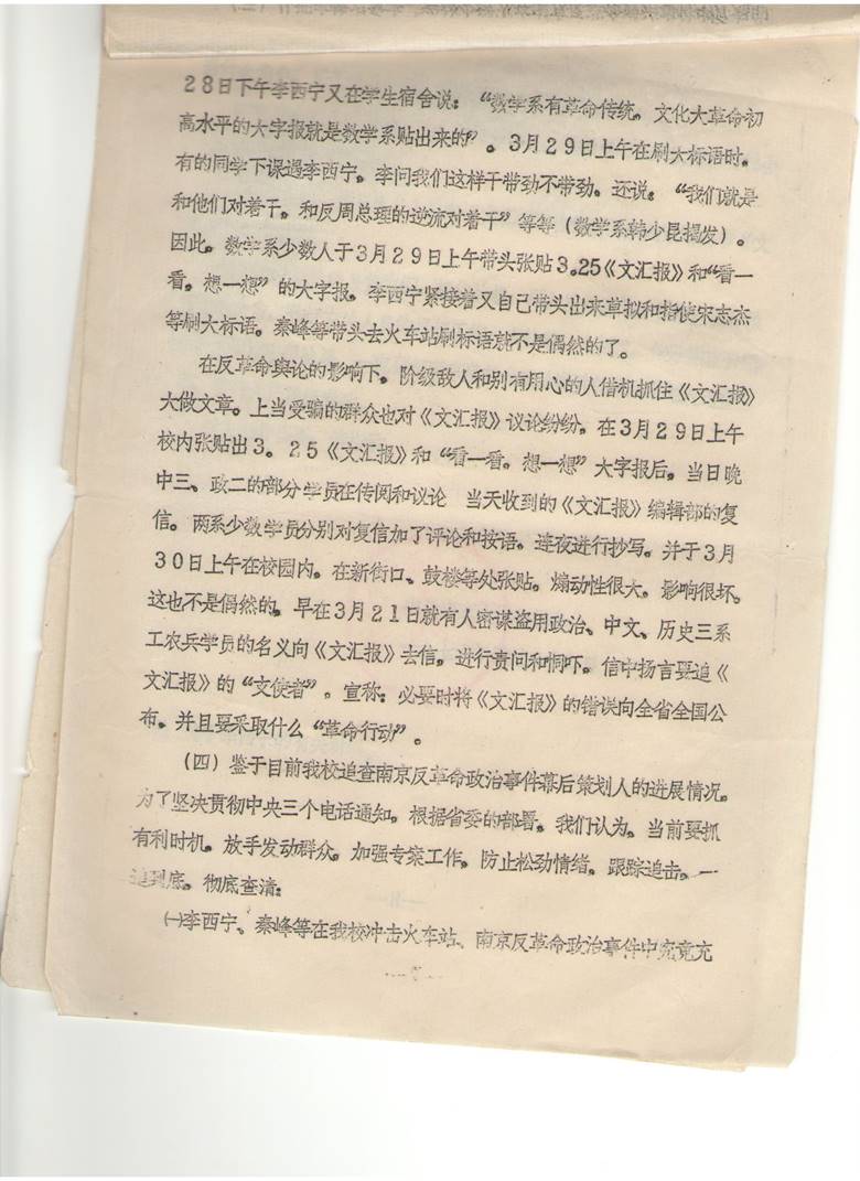 在反革命舆论的影响下,阶级敌人和别有用心的人借机会抓住《文汇报》大作文章。上当受骗的群众也对《文汇报》议论纷纷。在3月29日上午校内张贴出3.25《文汇报》和“看一看,想一想”的大字报后,当晚中三,政二的部分学员在传阅和议论当天收到的《文汇报》编辑部的复信。两系少数学员分别对复信加了评论和按语,连夜进行抄写,并于3月30日上午在校园内,在新街口、鼓楼等出张贴。煽动性很大,影响很坏。这也不是偶然的。早在3月21日就有人密谋盗用政治、中文、历史三系工农兵学员的名义向《文汇报》去信,进行责问与恫吓。信中扬言要追《文汇报》的“支使者”。宣称:必要时将《文汇报》的错误向全省全国公布,并且要采取什么“革命行动”。